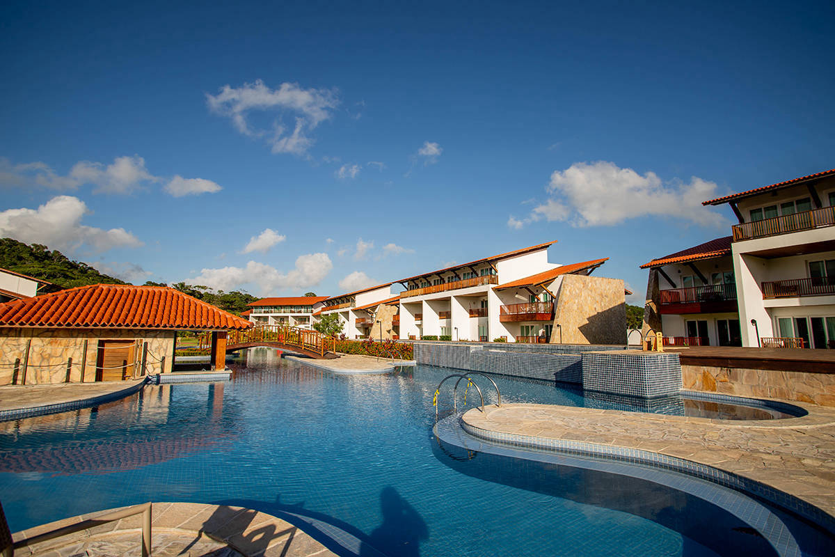 Pavimento inferior: hall, sala para dois ambientes que dá acesso ao terraço com magnífica vista para os jardins e à piscina principal do complexo, uma ampla suíte VIP, cozinha e WC social.